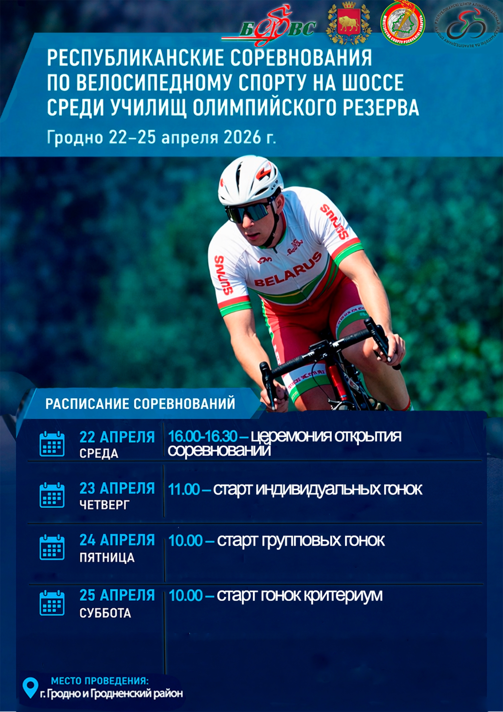 Турнир в Гродно традиционно считается важным этапом для просмотра ближайшего резерва национальной сборной. Спортсменов ждет насыщенная четырехдневная программа, включающая ключевые шоссейные дисциплины.